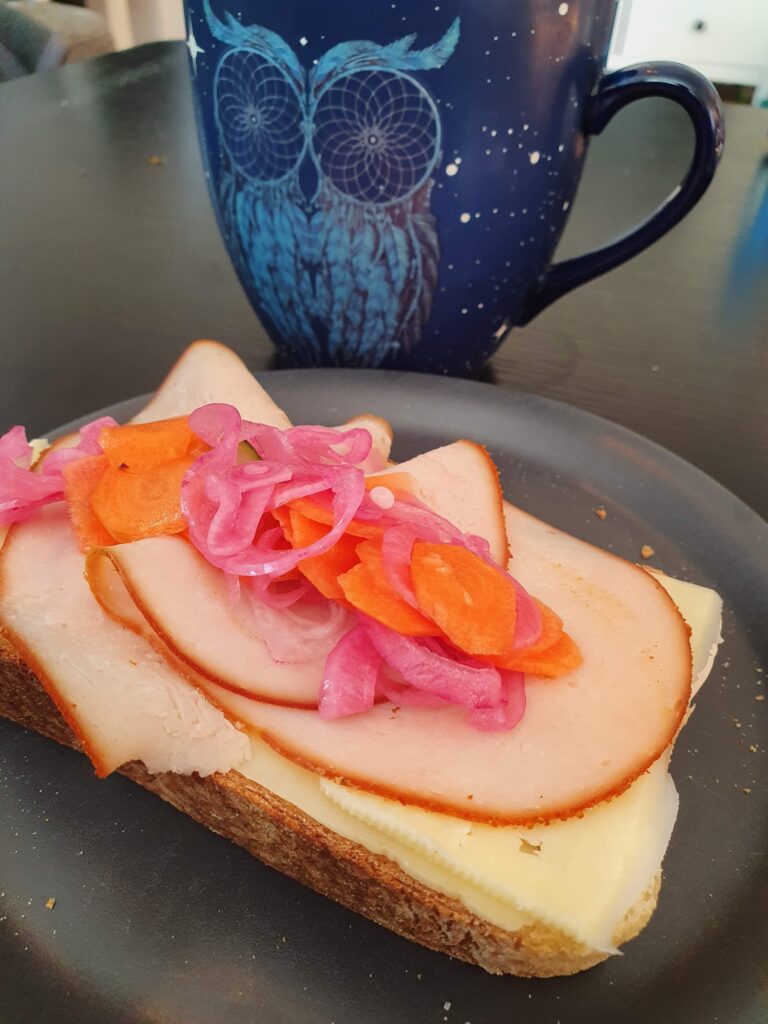 Det är som att öppnat dörren till en helt ny värld där man kan pickla allt och inser nu att man kan variera både grönsaker och smak på lagen till det oändliga. Så nya rutinen är att på söndagar (som nu är döpt till pickelsöndag) så tittar jag i kylen och ser vilka småledsna grönsaker jag har och sen pickar jag dem… rödlök, morot, zucchini, purjolök… ner med det bara.. och gärna tillsammans så man får lite av allt. Lägg den sen på pizza, i hambugaren, på pulled pork, i tacosen , på mackan…. seriöst- ALLT blir bättre med lite picklade grönsaker på.